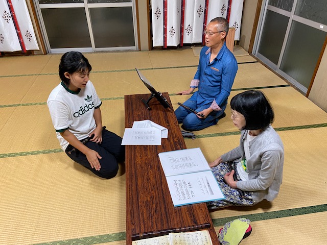 その後は部屋に戻り、初級者を対象に「越殿楽」の1行目を唱歌、演奏を繰り返し練習しました。