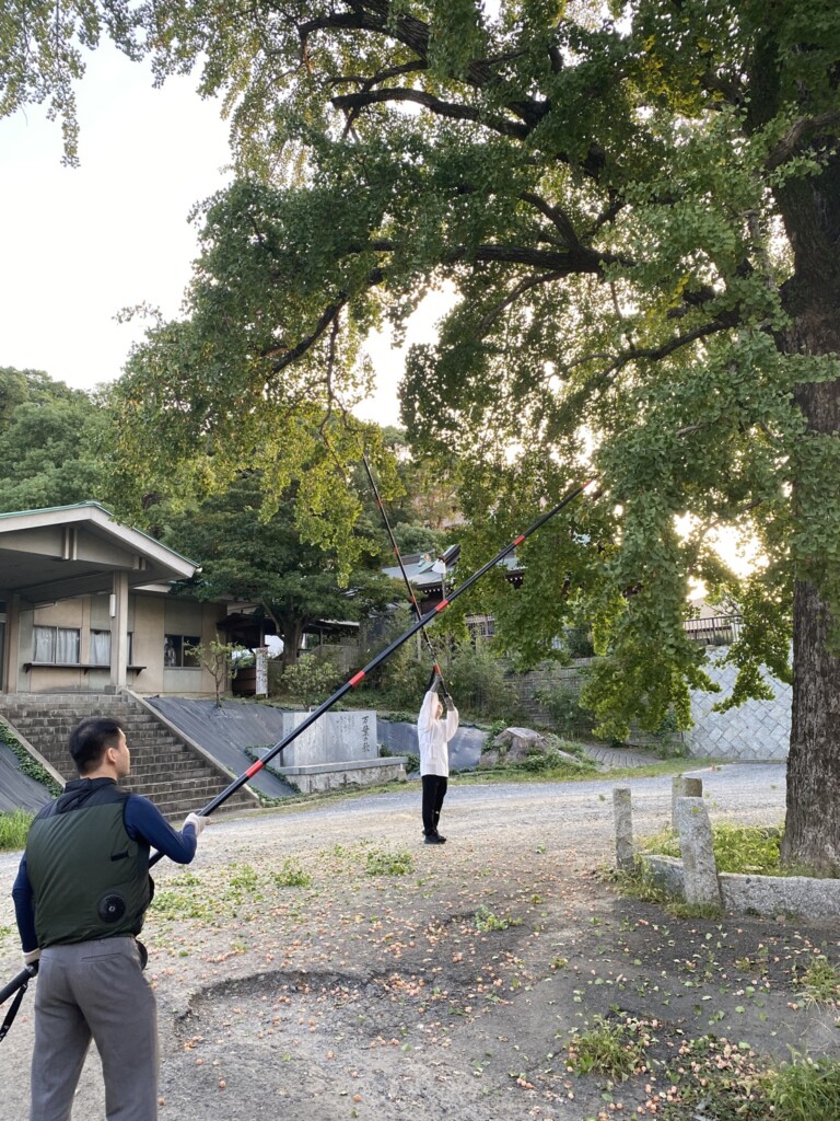 特殊な棒で銀杏を叩き落し