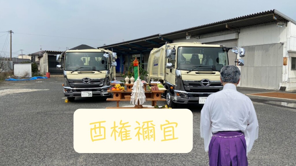 車2台の前に祭壇を設け祝詞を奏上し、